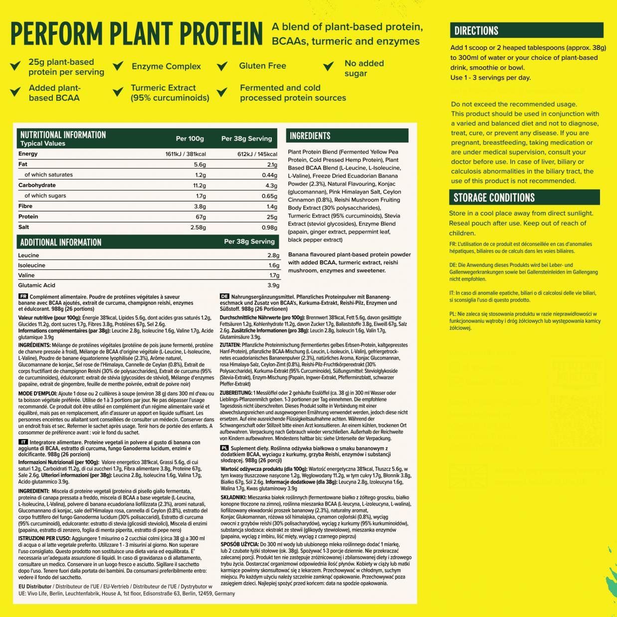 Fermented Yellow Pea Protein, Cold Pressed Hemp Protein, Plant Based BCAA Blend (L-Leucine, L-Isoleucine, L-Valine), Freeze Dried Ecuadorian Banana Powder, Natural Banana Flavouring, Reishi Mushroom Fruiting Body Dual Extract (30% polysaccharides), Konjac Fibre, Pink Himalayan Salt, Ceylon Cinnamon, Turmeric Extract (95% curcuminoids), Stevia Extract (steviol glycosides), Enzyme Blend (papain, ginger extract, peppermint leaf, fennel seed)