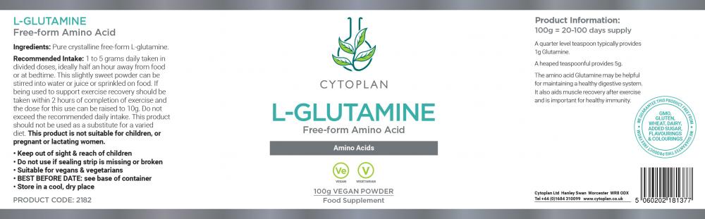 1 to 5 grams daily taken in divided doses, ideally half an hour away from food or at bedtime. This slightly sweet powder can be stirred into water or juice or sprinkled on food. If being used to support exercise recovery, it should be taken within two hours of completion of exercise and the dose for this use can be raised to 10g, or take as directed by a practitioner. A quarter level teaspoon typically provides 1g L-Glutamine. A heaped teaspoonful provides 5g.