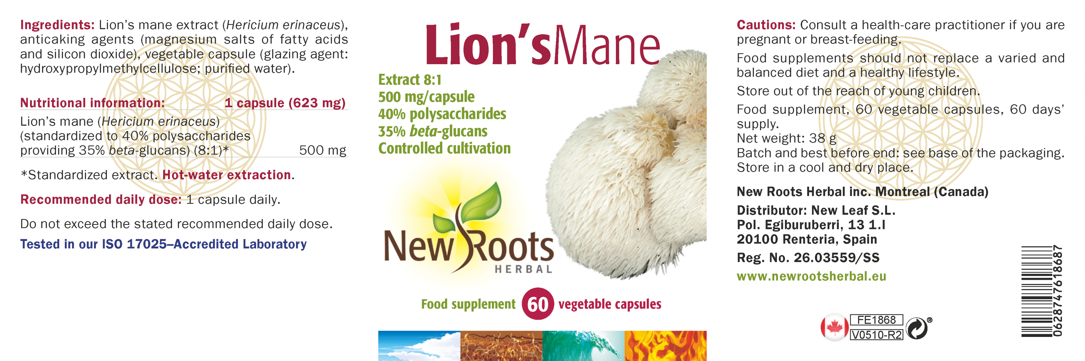 Pure, high-strength extract (8:1, 40% polysaccharides) of Hericium erinaceus, 500mg per capsule. From controlled and sustainable cultivation in oak tree trunks, free of heavy metals, herbicides and pesticides to guarantee the strength and purity. Suitable for coeliacs, vegetarians and vegans.