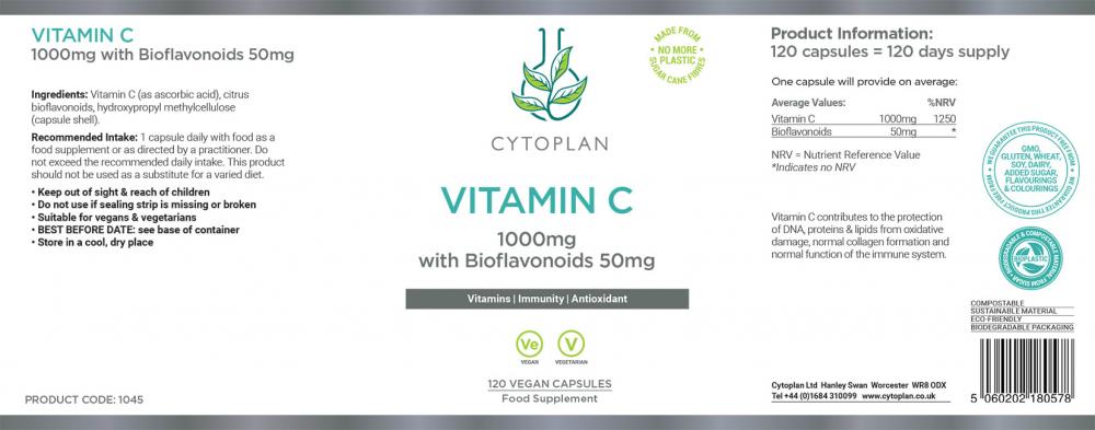 1000mg of ascorbic acid per capsule plus 50mg of bioflavonoids. Vitamin C is best absorbed in the presence of bioflavonoids as most bioflavonoids are citrus-derived. Please note: this is not a Food State item.