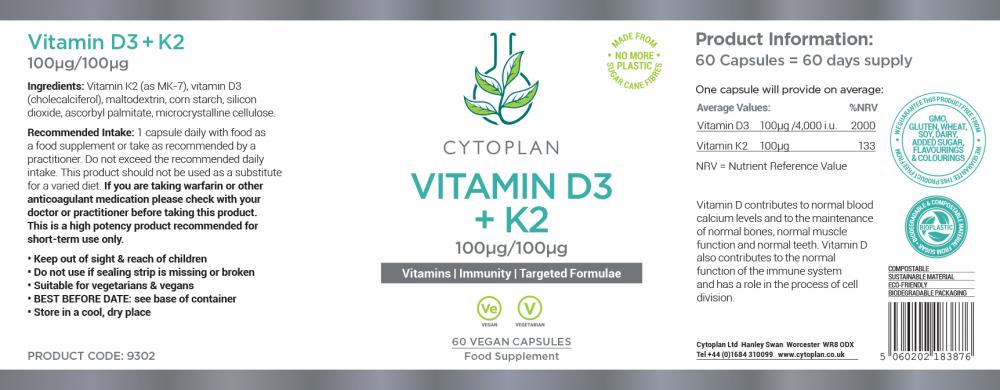 This product contains 100ug (4,000 i.u.) Vitamin D3 and 100ug Vitamin K2 (Mk-7) and is designed to elevate levels of D3/K2 and is ideally used in conjunction with any of Cytoplan's multiformulae.