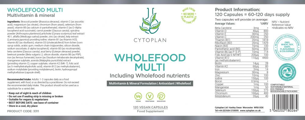 Broccoli powder (brassica oleracea), Vitamin C (as ascorbic acid), Magnesium (as citrate), Chromium (from yeast), Selenium (from yeast), Vitamin B5 (as calcium d-pantothenate), Vitamin E (as D-Alpha tocopherol acid succinate), Carrot powder (Daucus carota), Spirulina powder (Arthrospira plantensis), Artichoke (Cynara scolymus) leaf extract 40:1, Alfalfa (Medicago sativa) powder, Zinc (as citrate), Kelp extract (Laminaria japonica) providing iodine, Vitamin B1 (as thiamin Hcl), Vitamin B2 (as Riboflavin), Vitamin D3 (cholecalciferol) from lichen (corn syrup solids, arabic gum, medium chain triglycerides, silicon dioxide, sodium ascorbate, d-alpha tocopherol), Vitamin B3 ( as nicotinamide), Beta carotene (Daucus carota), Acai berry (Euterpe oleracea) powder, Beetroot powder (Beta vulgaris L), Silicon dioxide, Vitamin B6 (as P5P), Iron (as ferrous fumarate), Boron (as Disodium tetraborate decahydrate), Manganese sulphate, Acerola (Malpighia punicifolia) extract (providing vitamin C), Copper sulphate, Vitamin K2 (MK-7), Folic acid (as 5-methyltetrahydrofolic acid), Vitamin B12 (as methylcobalamin), Sodium molybdate (providing molybdenum), Biotin, Hydroxypropyl methylcellulose (capsule shell).
